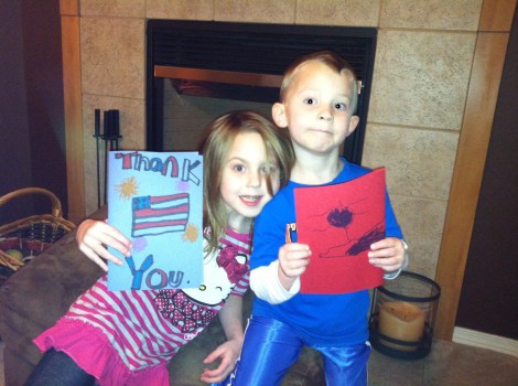 Hello again everyone! My children and I had a wonderful time with last week’s assignment creating cards for the troops. Check out their handiwork below!