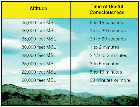 As you can see in the chart below, the higher in altitude you fly, the less time you have to recover before a lack of oxygen renders you unable to function.